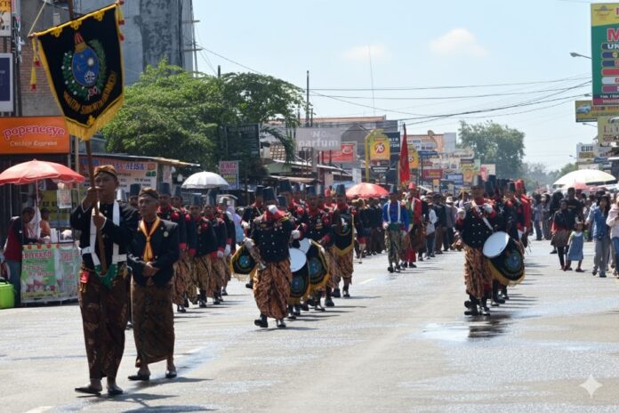 LESINDO.COM – Di bawah terik matahari siang, barisan prajurit berseragam hitam dengan blangkon tinggi dan jarik batik sogan berjalan tegap di jalan utama Kartasura. Para prajurit yang sudah memasuki usia senja masih terlibat dalam kirab budaya HUT Kartasura ke 345 sebagai salah satu pembuka jalan atau cucuk lampah. Di tangan mereka tergenggam genderang besar bertuliskan “Karaton Surakarta Hadiningrat”. Langkah mereka mantap, meski usia tak lagi muda. Irama tabuhan drum berpadu dengan gemerincing sorai penonton yang memadati pinggiran jalan.