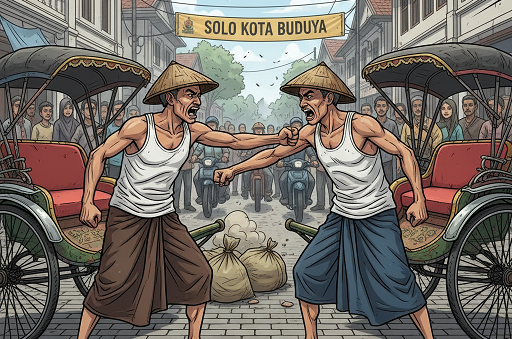 Dua pengemudi becak saling bertengkar tepat di depan pintu masuk. Suara keras, tubuh yang saling dorong, hingga wajah yang berlumur darah membuat udara panas kian terasa sesak. Beberapa pengemudi lain bergegas melerai, menarik keduanya agar tak jatuh dalam luka yang lebih dalam.