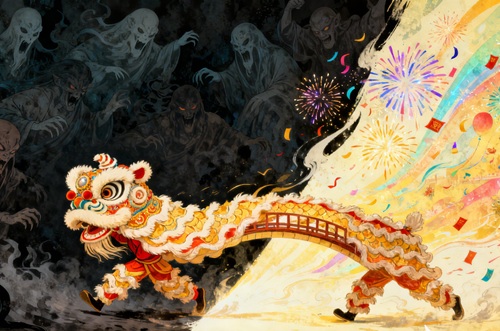 Legenda tentang makhluk bernama Nian menjadi titik awal dari seluruh simbolisme ini. Konon, makhluk buas itu muncul setiap akhir tahun untuk meneror desa-desa: memangsa ternak, merusak ladang, dan menebar ketakutan. Dari cerita turun-temurun itulah lahir strategi kolektif untuk bertahan—menggantung kain merah di pintu, menyalakan petasan, memukul-mukul benda logam agar bising. Merah dipercaya mampu melemahkan Nian, sementara suara keras membuatnya lari terbirit-birit. Di titik ini, Imlek tidak lagi sekadar perayaan, melainkan sisa-sisa ingatan manusia akan rasa takut purba—yang kini diubah menjadi pesta cahaya dan warna.