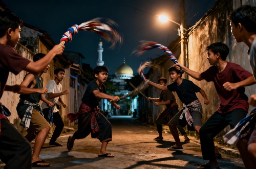 LESINDO.COM – Di antara lengang dini hari, ketika azan Subuh belum lagi menyentuh langit, jalanan kota justru riuh oleh teriakan yang ganjil. Bukan lantunan doa, bukan pula langkah-langkah menuju masjid. Yang terdengar adalah dentuman sarung berisi batu yang diayunkan seperti cambuk. Anak-anak belasan tahun berlarian, sebagian merekam, sebagian menantang, sebagian hanya ingin diakui.