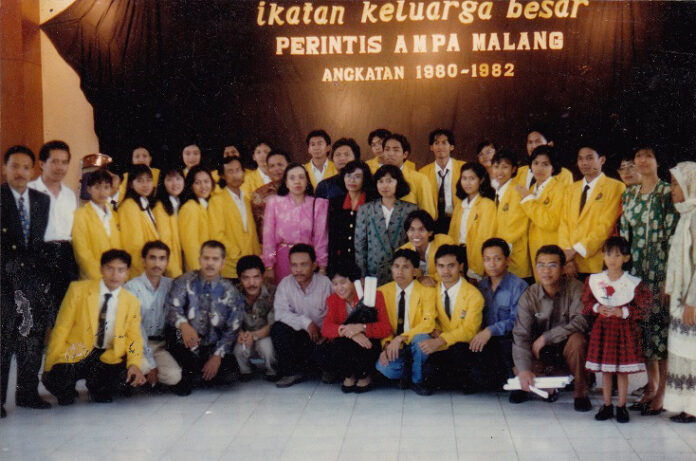 Sebuah foto lawas merekam momen hangat ikatan keluarga besar Perintis AMPA Malang angkatan 1980–1982. AMPA pastinya adalah pendahulu sebelum menjadi Universitas Gajayana Malang atau UNIGA, dengan latar belakang hitam dengan tulisan emas menjadi saksi kebersamaan yang kembali dipererat, setelah puluhan tahun waktu berjarak. Di barisan belakang, tampak para alumni muda kala itu mengenakan jas kuning cerah seragam kebanggaan yang menjadi identitas kebersamaan mereka. Warna itu seakan melambangkan semangat optimisme dan tekad perjuangan masa mahasiswa. Foto ini bukan hanya potret reuni, melainkan juga pengingat akan perjalanan panjang dari masa belajar, jatuh bangun merintis kehidupan, hingga kini berkumpul kembali dalam bingkai nostalgia dan rasa persaudaraan.
