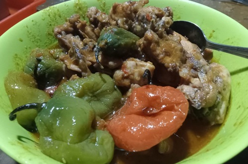 Di mangkuk itu, tetelan tulang ayam tampak menumpuk dengan warna kecokelatan pekat. Potongan-potongan tulang kecil masih berbalut daging sisa—jenis bagian yang tidak mewah, tapi justru menyimpan rasa paling kuat. Beberapa cabai gendot—ada yang hijau segar, ada yang jingga matang—dibiarkan utuh hingga kulitnya keriput dan pecah di beberapa sisi, tanda bahwa cabai telah menyerah pada panas bumbu dan menyebarkan rasa pedasnya ke seluruh kuah.