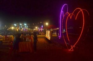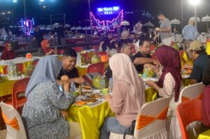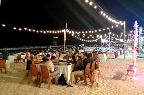 Lampu-lampu kuning digantung rendah, berjejer seperti garis doa yang tak putus-putus. Saat kulihat dari bawah, cahaya itu jatuh lembut ke meja-meja yang penuh orang. Di sanalah aku merasa kecil—kecil tapi tidak sendirian. Ada keluarga yang tertawa, ada pasangan yang saling mencuri pandang, ada anak kecil yang berlari sambil menyeret gaunnya, meninggalkan jejak-jejak kecil di pasir yang sebentar lagi pasti hilang oleh angin.