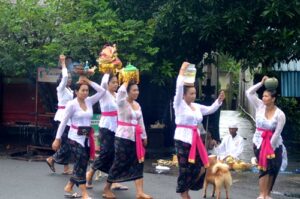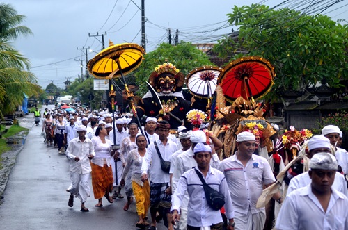 Ratusan umat Hindu di Bali beriringan menyusuri jalan desa dengan busana adat serba putih. Di antara mereka, tampak barong dan umbul-umbul suci menjulang tinggi, sementara di tangan beberapa orang, kendi berisi air dan sesaji bunga dijaga dengan penuh hati-hati. Hujan yang membasahi tanah tidak dianggap gangguan, melainkan berkah yang menambah kesakralan suasana.