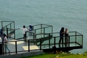 Di area utama, deretan spot foto bertema romantis dan futuristik seolah bersaing menarik perhatian. Ada jembatan kaca yang langsung menghadap laut, balon udara warna-warni, hingga bingkai raksasa dengan latar samudera. Namun yang paling dicari adalah momen senja — ketika matahari perlahan tenggelam di cakrawala, meninggalkan jejak warna oranye keemasan yang menari di permukaan air.