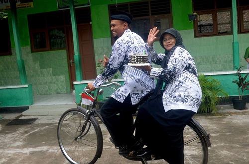 LESINDO.COM – Di sebuah halaman sekolah sederhana yang berlapis cat hijau—warna yang menenangkan seperti pekarangan pedesaan Jawa—sepasang guru tampak mengayuh sepeda ontel bersama. Keduanya mengenakan seragam PGRI yang akrab dengan motif hitam-putih, seolah menjadi penanda kesetiaan pada profesi yang jarang benar-benar selesai meski bel pulang sudah lama berbunyi. Di belakang, sang rekan membawa kue kecil dengan angka sederhana, melambangkan pertambahan usia sekaligus harapan yang ikut mengiringi setiap tahun baru yang mereka jalani sebagai pendidik.