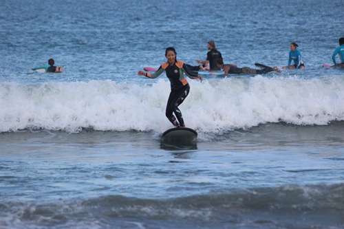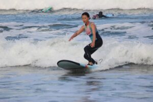 Perempuan yang tampak lincah di atas papan itu sudah dua kali terjatuh sebelumnya. Setiap kali tersungkur, ia bangkit kembali dengan tawa yang menyembur, bukan frustrasi. “Rasanya campur aduk. Deg-degan, tapi senang,” katanya ketika kembali ke tepi pantai untuk beristirahat sebentar. “Saya tidak menyangka bisa berdiri. Ternyata lebih sulit menaklukkan rasa takut daripada ombaknya.”