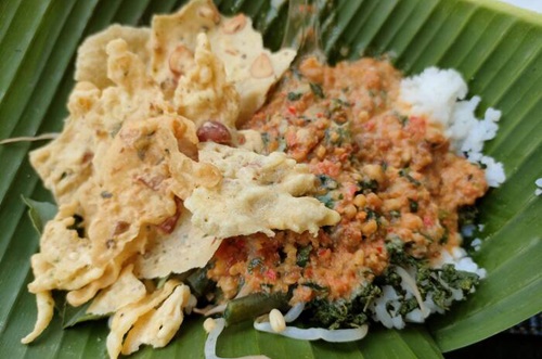 Sambal kacangnya tidak terlalu halus; tekstur kacang masih terasa di lidah. Aroma daun jeruk purut muncul tegas, segar, dan khas. Sayurannya bukan sekadar pelengkap: kangkung, tauge, bunga turi, kenikir, hingga lamtoro bersatu dalam satu pincuk.
