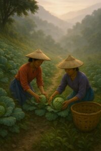Saat kabut pagi turun perlahan, menyelimuti lereng-lereng hijau Bedugul. Embun menggantung di ujung daun kol, memantulkan cahaya pertama dari matahari yang malu-malu menembus pepohonan. Suara ayam berkokok bersahutan dari kejauhan, berpadu dengan denting alat cangkul dan seruan lembut para petani. Di antara suara alam yang hidup itu, d