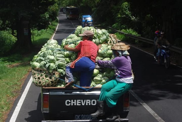LESINDO.COM – Di bawah terik matahari siang, sebuah mobil bak terbuka melaju pelan di jalan tikungan mesra berliku lereng Bedugul. Di bak belakangnya, dua perempuan Tangguh duduk di antara tumpukan sayuran segar kol, hasil panen yang baru saja dipetik dari kebun di ketinggian. Tubuh mereka berguncang setiap kali mobil melibas tikungan tajam, namun tangan-tangan kasar itu tetap erat menggenggam jaring pengaman. Tak ada sabuk pengaman, tak ada ruang nyaman, hanya tekad dan kebiasaan yang membuat mereka tetap tenang di atas tumpukan hasil bumi.
