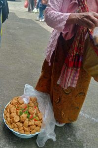 Di antara lanskap alami yang indah ini, berdirilah seorang perempuan tua penjual tahu, sosok yang mungkin tak disadari banyak wisatawan, tetapi menjadi denyut kecil pasar itu sendiri. Dengan kerudung merah jambu yang sudah memudar dan kebaya sederhana, ia menapaki lantai pasar yang sedikit lembap. Di pinggangnya tersampir keranjang kain besar berisi dagangan—tahu goreng, bumbu, dan kebutuhan kecil lain yang ia jajakan dari satu sudut ke sudut lain.