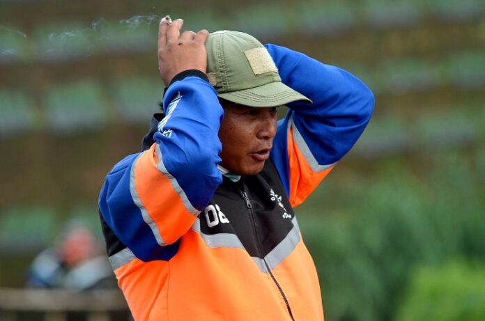 Sebatang rokok selalu menghiasi bibirnya, tubuhnya dibungkus jaket tebal berwarna biru-oranye yang merupakan komunitas ojek nepal van java. Ia tampak sedang beristirahat sambil merokok, dengan kedua tangan diangkat ke kepala. Latar belakang terlihat berupa terasering hijau khas lereng gunung, yang menandakan kehidupan pedesaan pegunungan. Gestur sederhana itu seolah menjadi simbol kedamaian tak perlu banyak hal untuk merasa cukup, asal hati tetap tenang.