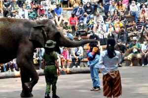 Pada jam-jam tertentu, kerumunan pengunjung akan mengalir ke area panggung terbuka. Salah satunya adalah panggung yang tampak dalam foto: seekor gajah besar dengan belalai yang lembut menyentuh seorang pengunjung anak muda yang sedang mengenakan rangkaian bunga warna-warni. Di sekeliling mereka, para pawang berjaga sambil tetap memberi ruang bagi momen alamiah antara manusia dan satwa.
