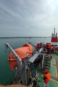 Selain simulasi penurunan sekoci, sebagian taruna taruni juga mempraktikkan penggunaan pelampung keselamatan. Dalam prosedur darurat, penumpang tetap diwajibkan menggunakan pelampung meskipun telah naik ke sekoci.