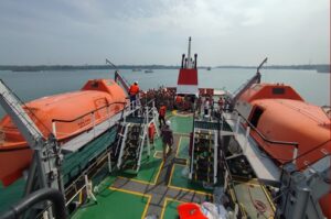 LESINDO.COM – Taruna dan taruni SMK Pelayaran mengikuti simulasi keadaan darurat meninggalkan kapal (abandon ship) di atas kapal latih KL. Bung Tomo yang sedang berlayaran beberapa mil dari di Pelabuhan Kalianget, Sumenep Kamis, tanggal 12 Februari 2026