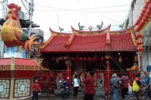 Namun tepat di selatan bangunan pasar legendaris itu, berdirilah sebuah bangunan yang tidak larut oleh hiruk-pikuk. Klenteng Tien Kok Sie—dengan warna merah dan kuning emas yang menyala—menjadi titik keheningan yang memandang denyut manusia dari jarak yang sangat dekat.
